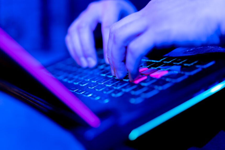 close-up of hands hacker pressing keys on keyboard in data center vulnerable cyber security server room technology digital world