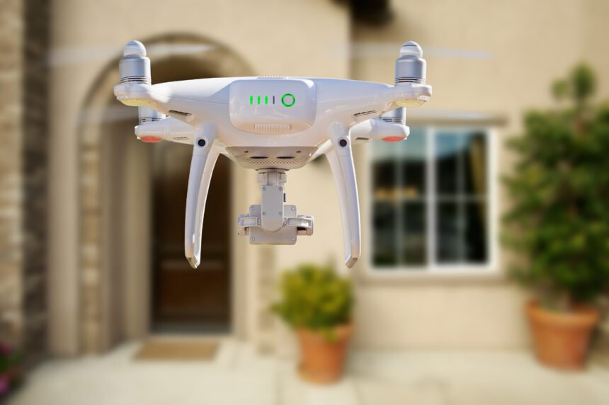 Back of Unmanned Aircraft System (UAV) Quadcopter Drone Flying In Front of House.