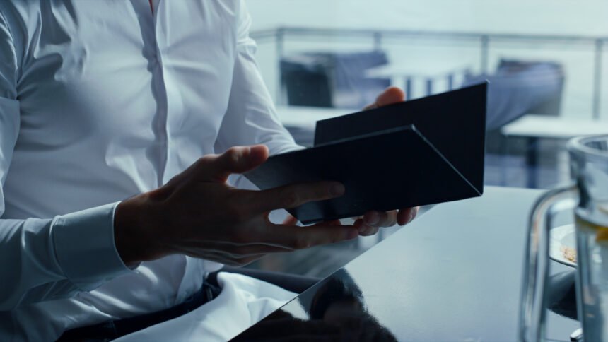 Unknown man reading restaurant bill at business lunch. Smart unrecognizable entrepreneur looking dinner food check. Close up male hands holding leather wallet in hotel cafe. Wealthy lifestyle concept.