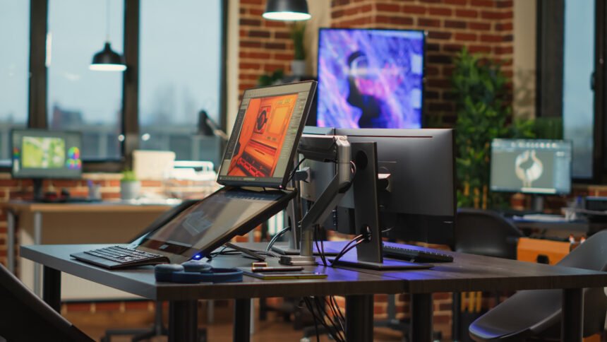 Empty creative agency studio filled with workstations to create content for modern production, running professional softwares. Programming technical prototype or developing game.